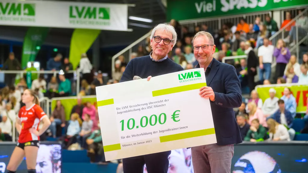 Zum ersten Heimspiel des USC Münster im neuen Jahr gab es vom Hauptsponsor LVM eine besondere Neujahrsüberraschung: LVM-Vorstand Peter Bochnia überreichte einen Spendenscheck in Höhe von 10.000 Euro für die Weiterbildung der Jugendtrainer:innen an USC-Präsident Martin Gesigora.